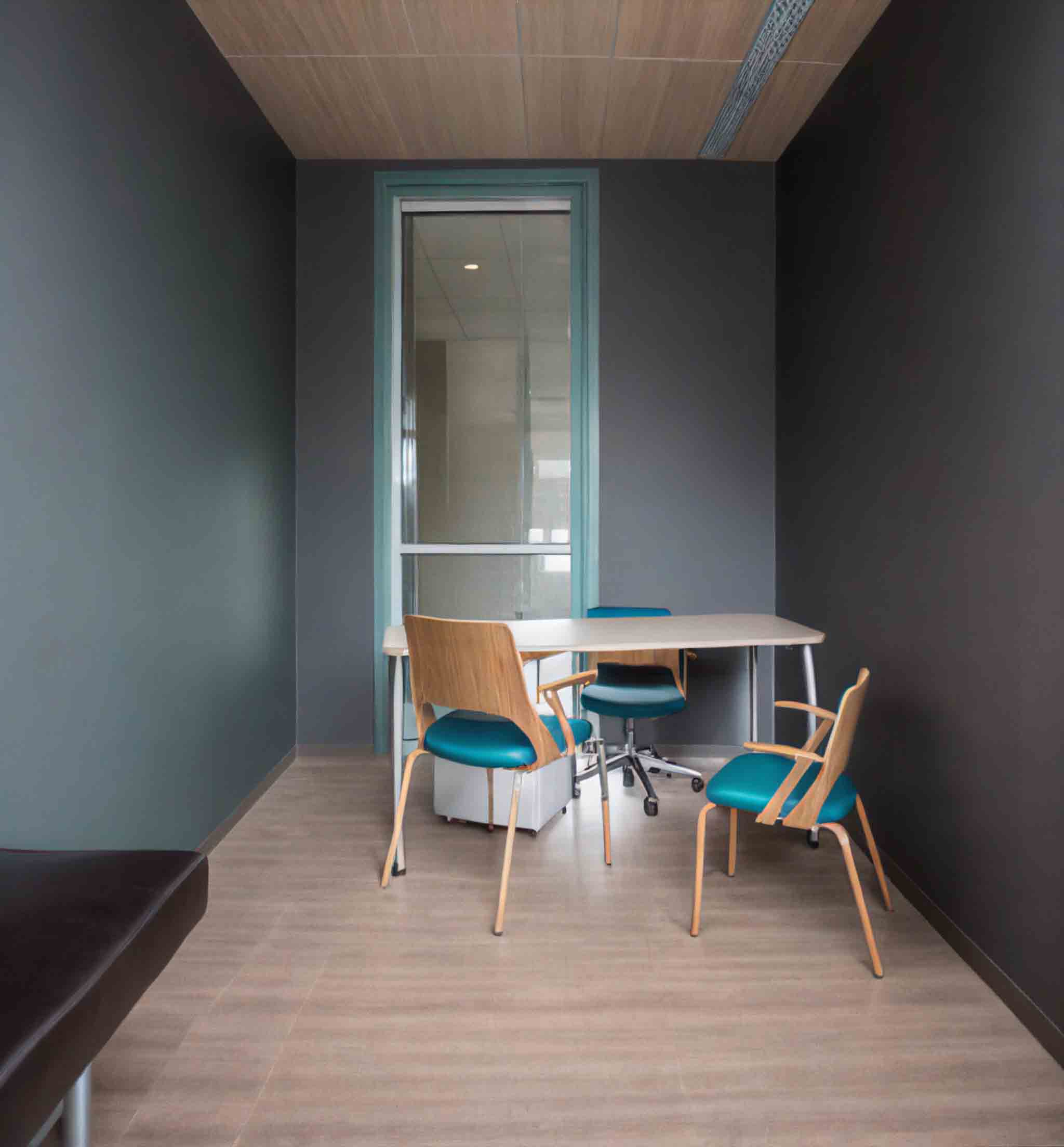 La massa dell’edificio così concepita viene interrotta per geometria e uso dei materiali lungo la porzione verticale volta a demarcare l’accesso di via Leopardi e con esso il retrostante collegamento verticale ai piani. Lungo tale direttrice, ampie vetrate, adeguatamente schermate da opportuni frangisole verticali, si contrappongo ai restanti serramenti del prospetto, illuminando ed incorniciando ambienti destinati alla sosta e deambulazione di utenza e personale addetto.